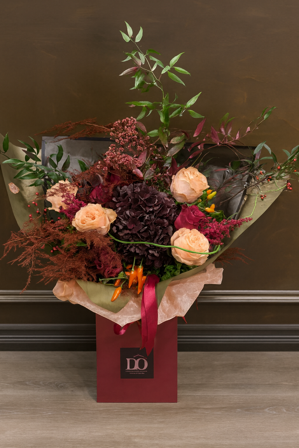 Celebrate the warmth and richness of the season with our Autumn Amber blooms bouquet a stunning arrangement inspired by the deep, earthy hues of fall. This bouquet combines elegant peach roses, lush burgundy hydrangeas, and seasonal foliage in tones of rust, crimson, and green, all beautifully arranged in a stylish presentation box.