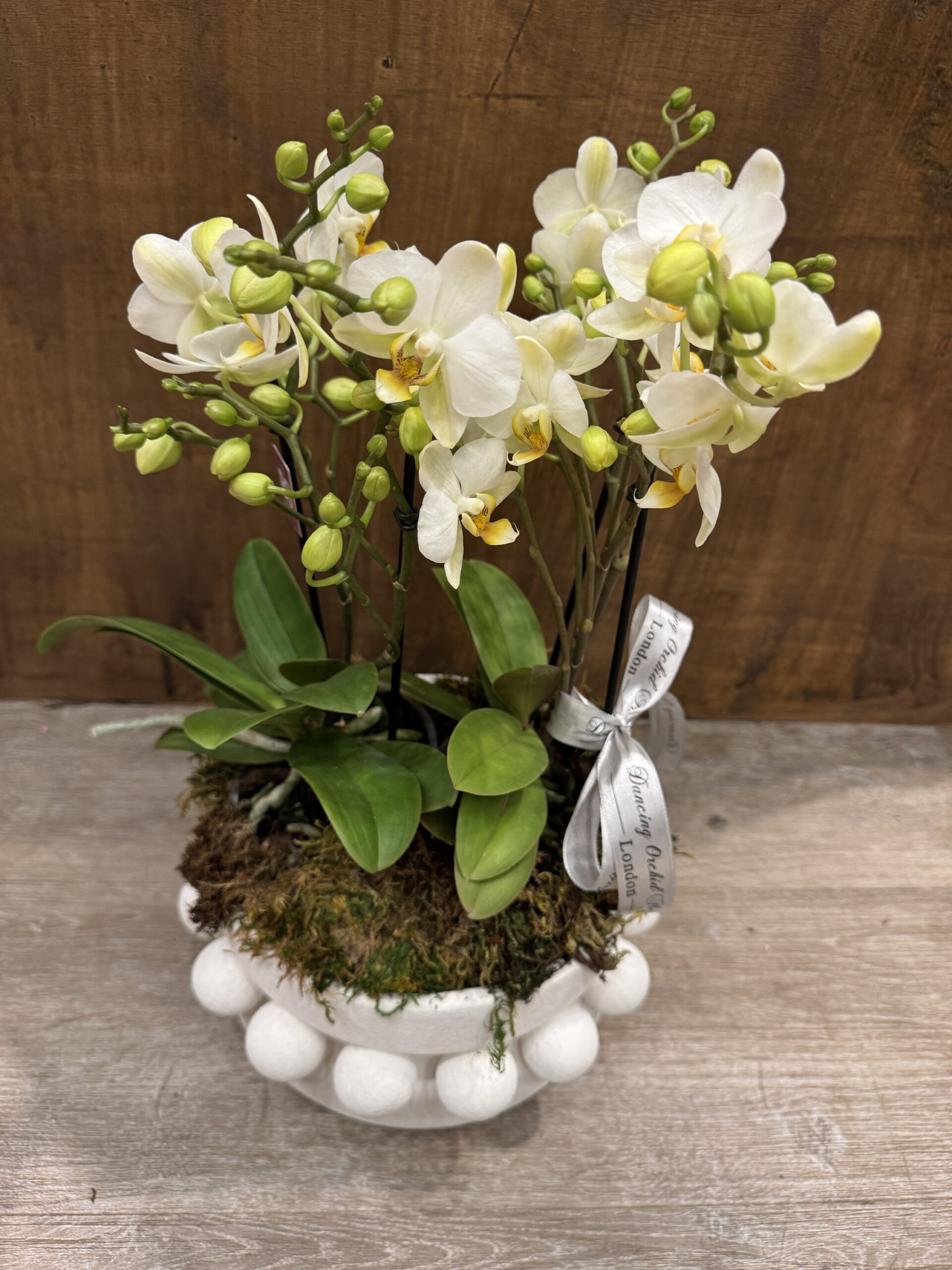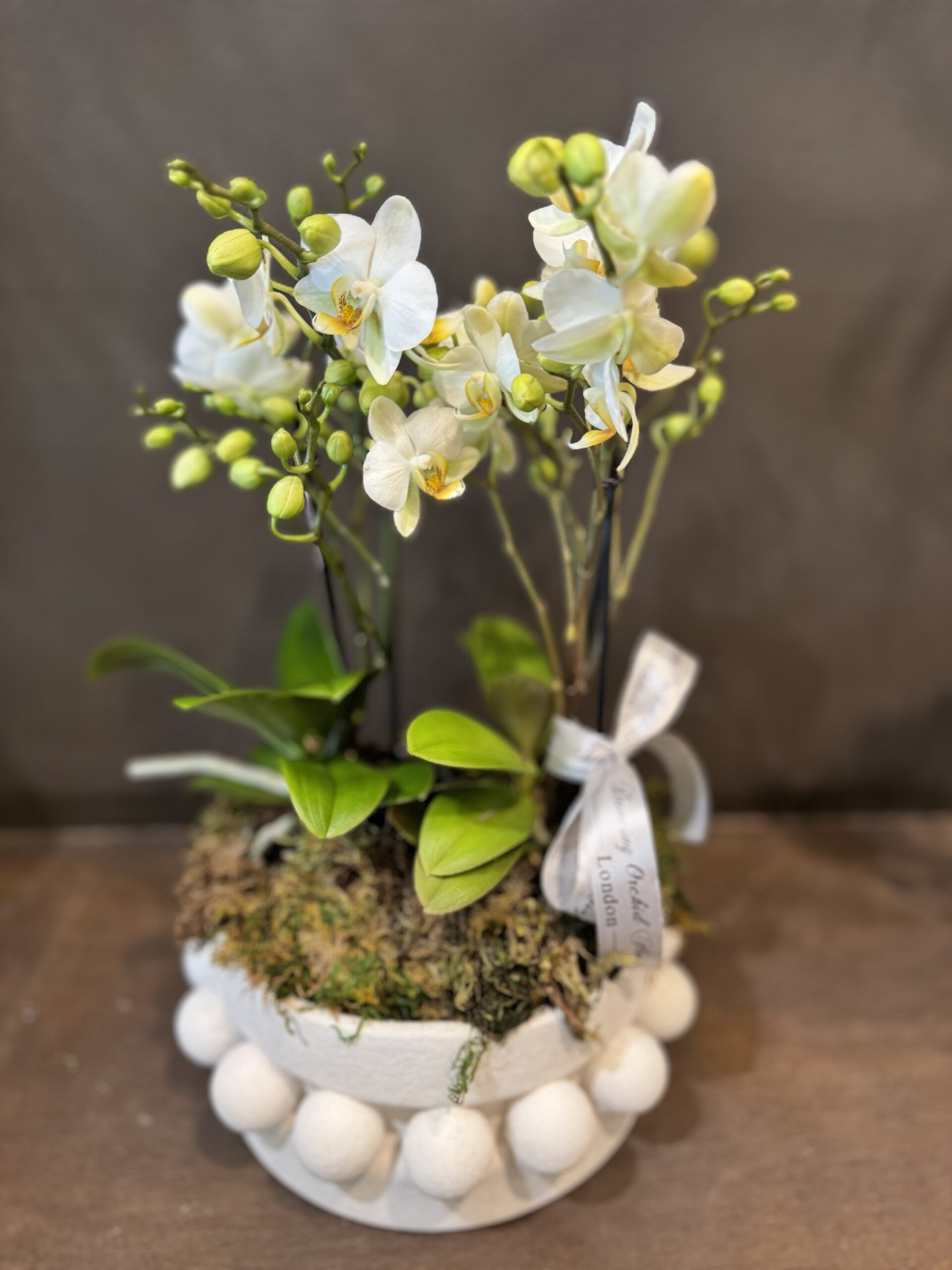 A refined composition of delicate miniature orchids, set in a handcrafted designer vase,available in limited quantities. Soft ivory blooms with subtle golden centres rise elegantly above fresh moss, creating a timeless piece that brings quiet luxury and natural grace into any interior,perfect for those who appreciate unusual and distinctive floral choices.
