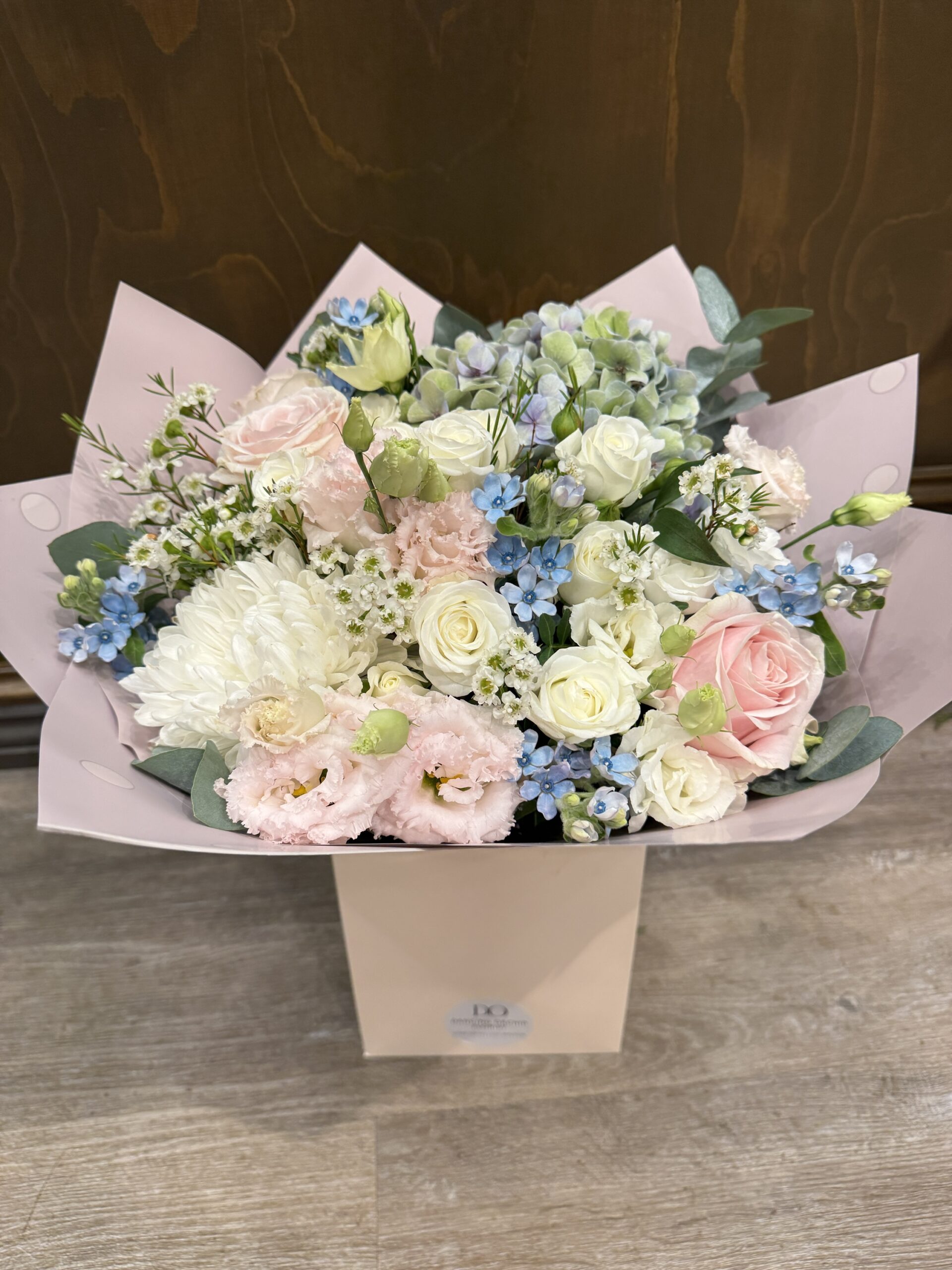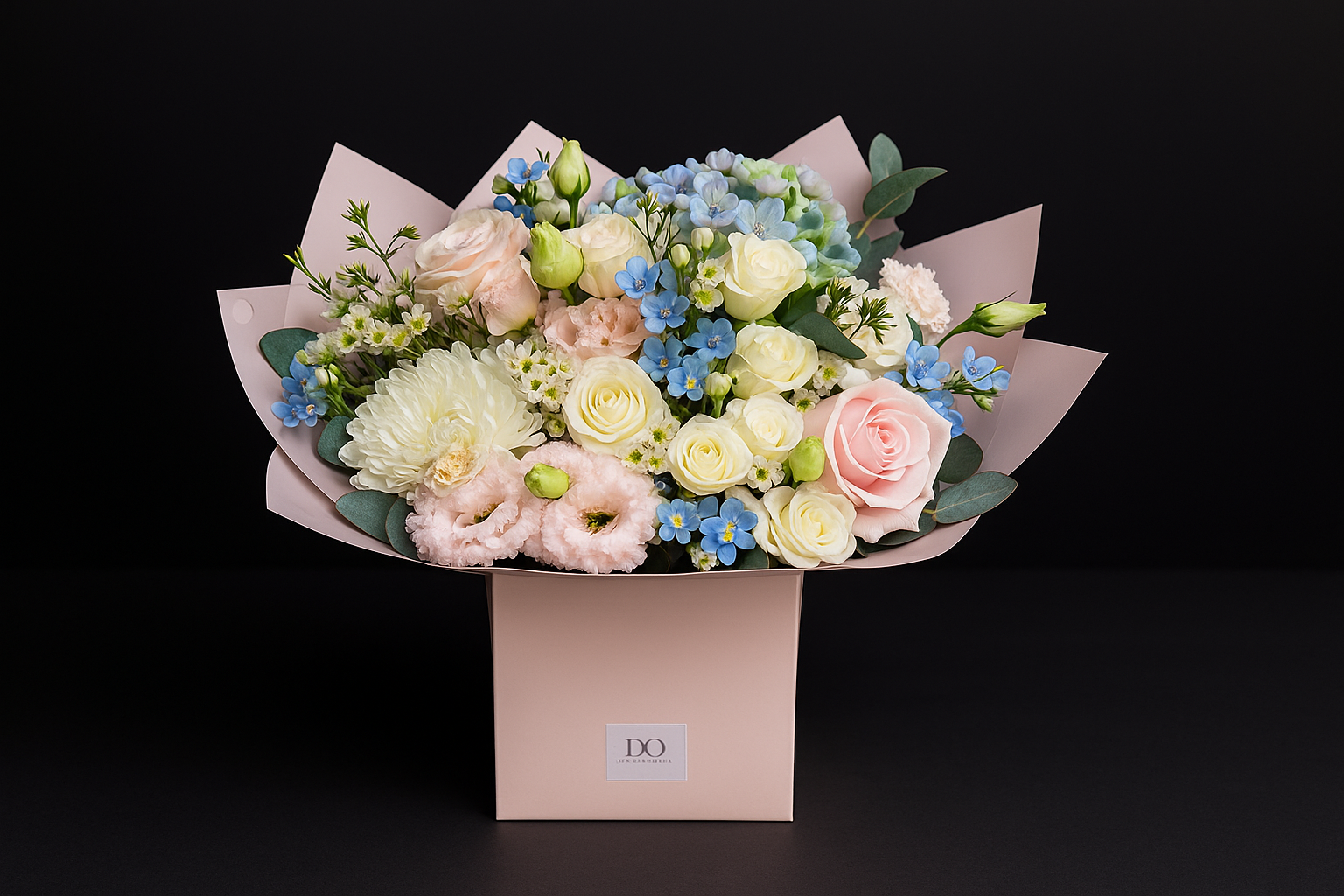 A delicate arrangement of premium roses, lisianthus, hydrangeas, and seasonal flowers in soft pastel tones — beautifully presented in our signature blush box. Perfect for birthdays, anniversaries, or simply to brighten someone’s day.