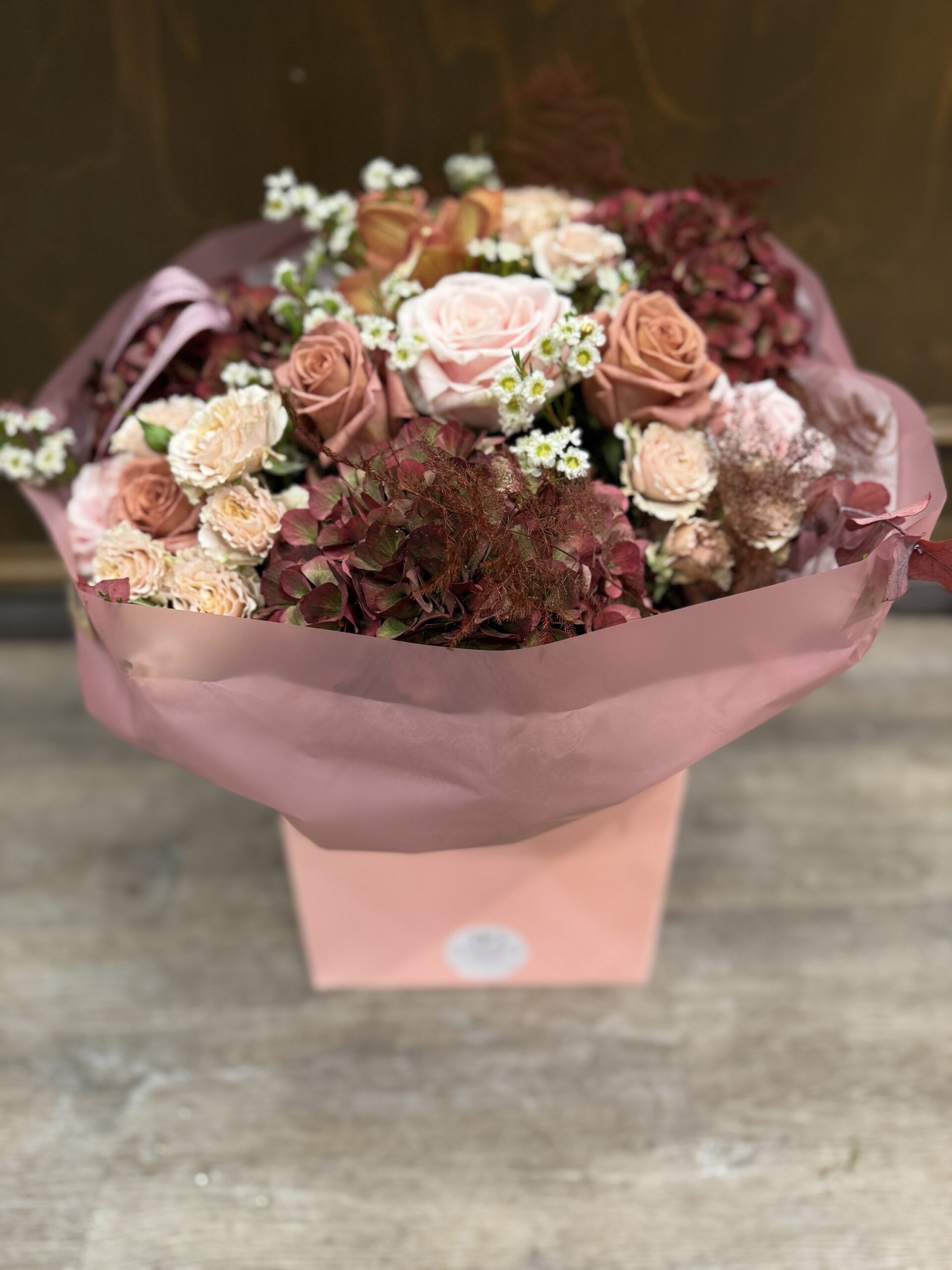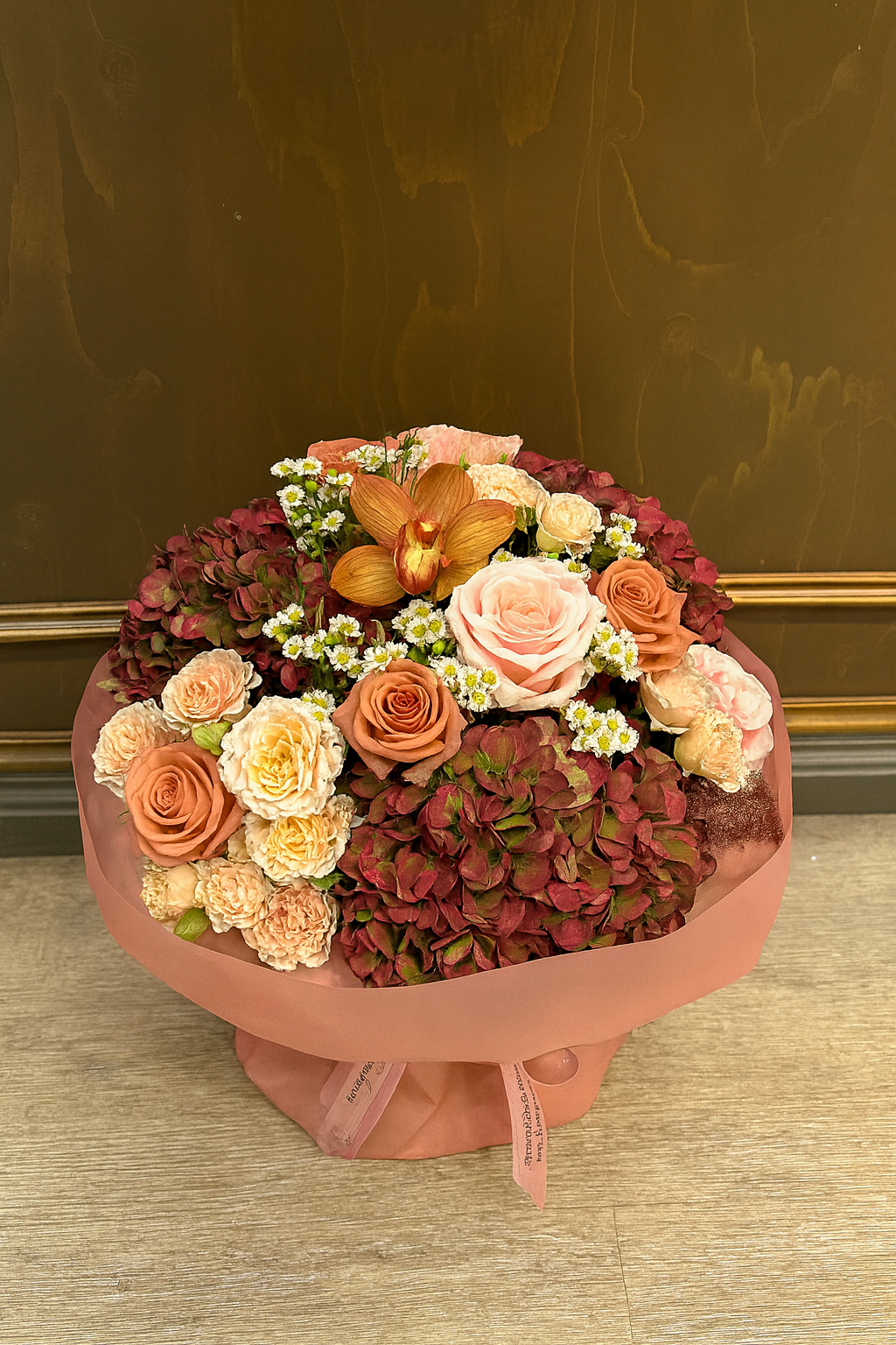 A graceful composition of roses, hydrangeas, and orchids in warm sunset hues. Each bloom is carefully arranged to create a perfect balance of elegance and emotion.